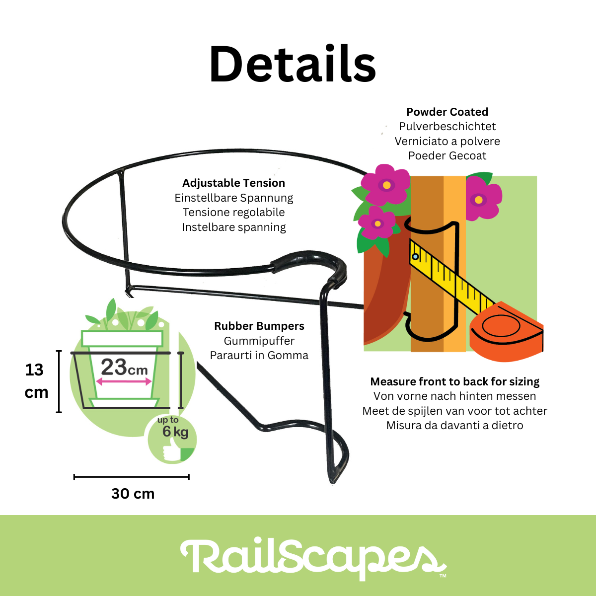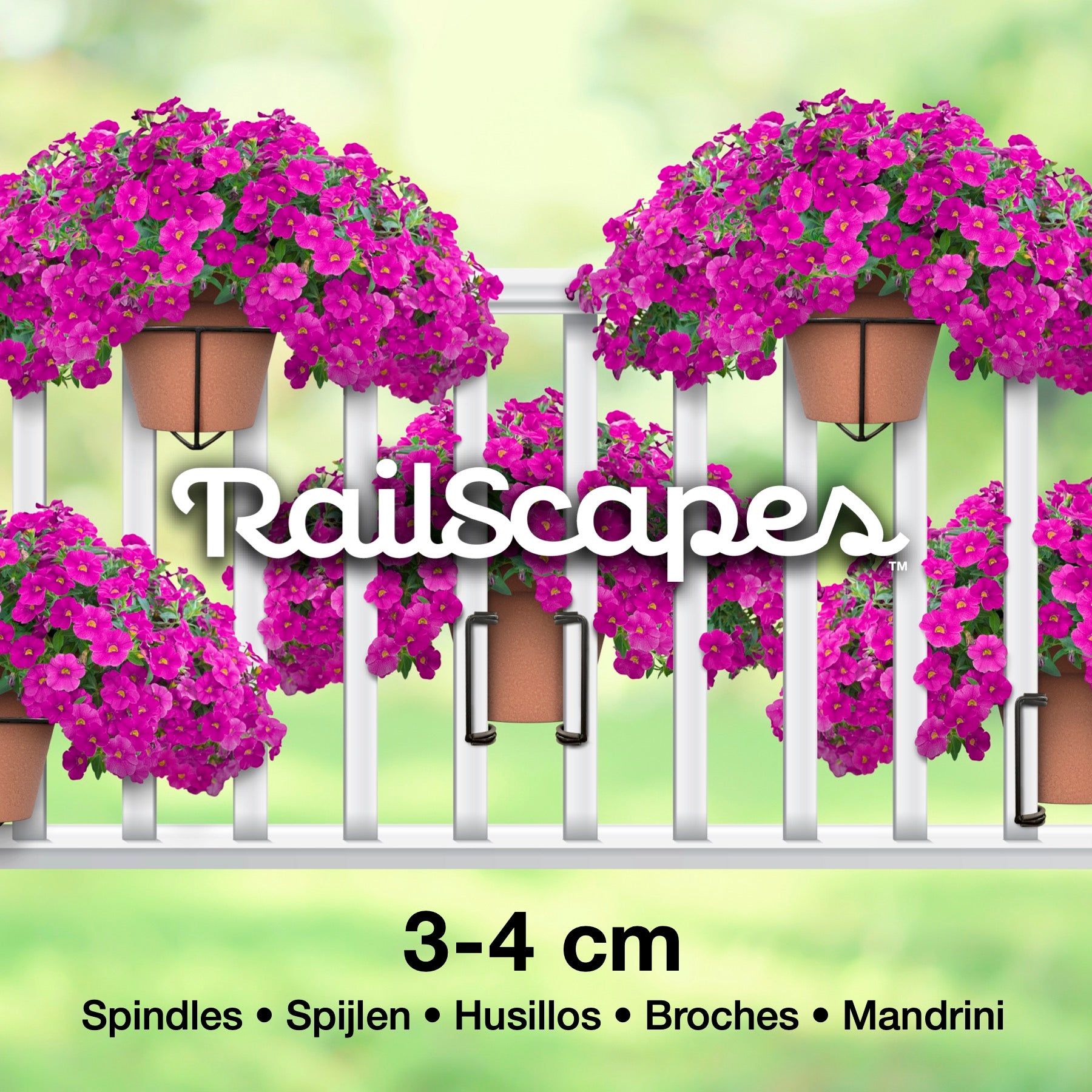 INSPIRADO EN EL JARDÍN BALCONFORT Los soportes para plantas RailScapes están diseñados para soportar un peso de hasta 6 kg en jardinería vertical. Estos soportes para plantas ligeros y sin herramientas son una revolución. Convierta su barandilla (de balcón) o partes verticales de la valla en un jardín flotante con el original soporte vertical para plantas.