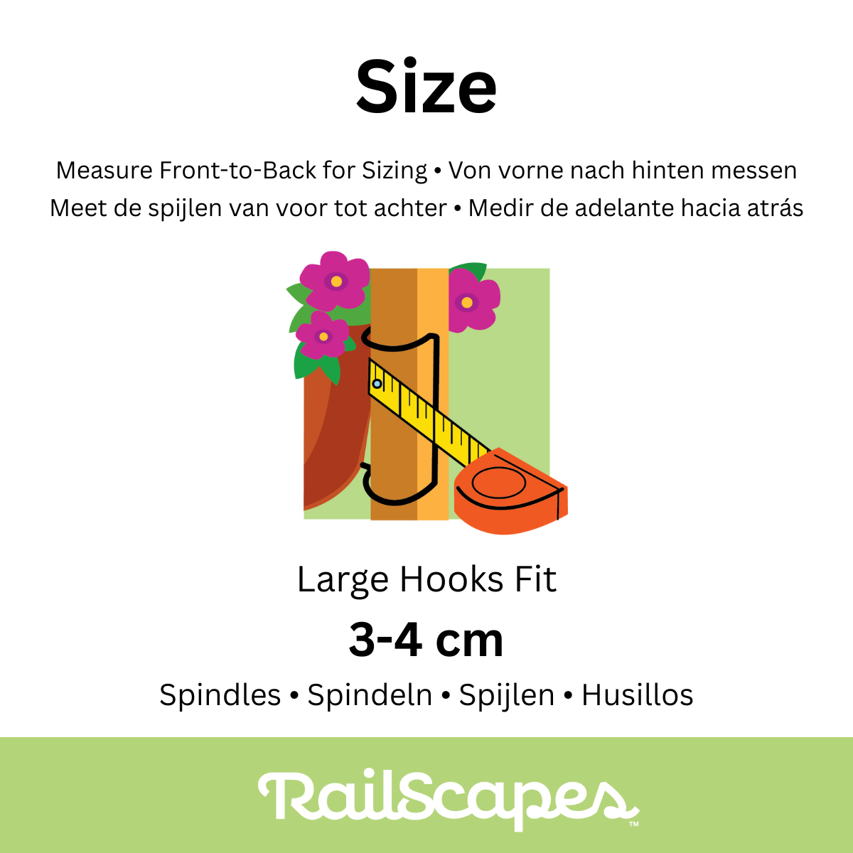 Tamaño (ver imagen)1,3 - 2,0 cm generalmente se adapta a barandillas de balcón de madera y metal